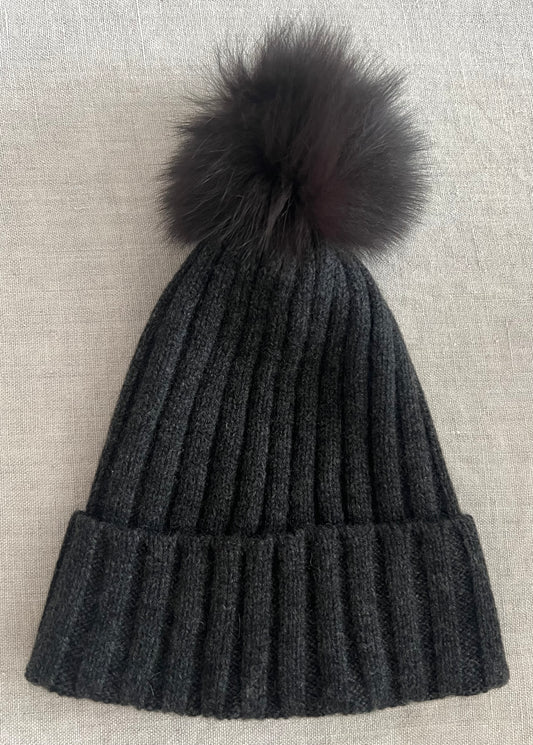 Cashmere beanie with fur pom pom dark grey