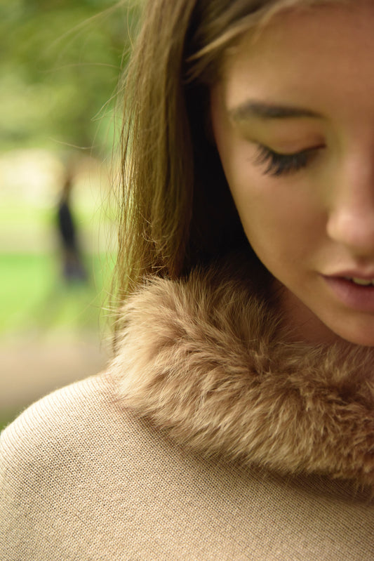 Cashmere poncho with fur collar camel